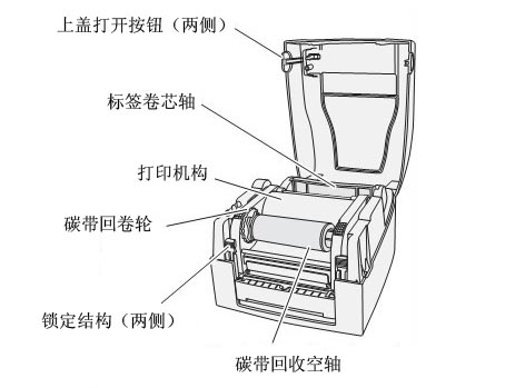 1.3 上蓋打開按鈕(兩側(cè))/標(biāo)簽卷芯軸/打印機(jī)構(gòu)/碳帶回卷輪/鎖定結(jié)構(gòu)(兩側(cè))/碳帶回收空軸