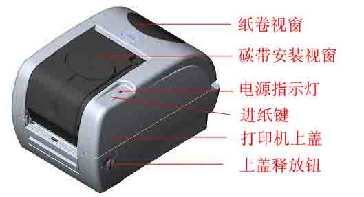 1.1 紙卷視窗/碳帶安裝視窗/電源指示燈/進紙鍵/打印機上蓋/上蓋釋放鈕